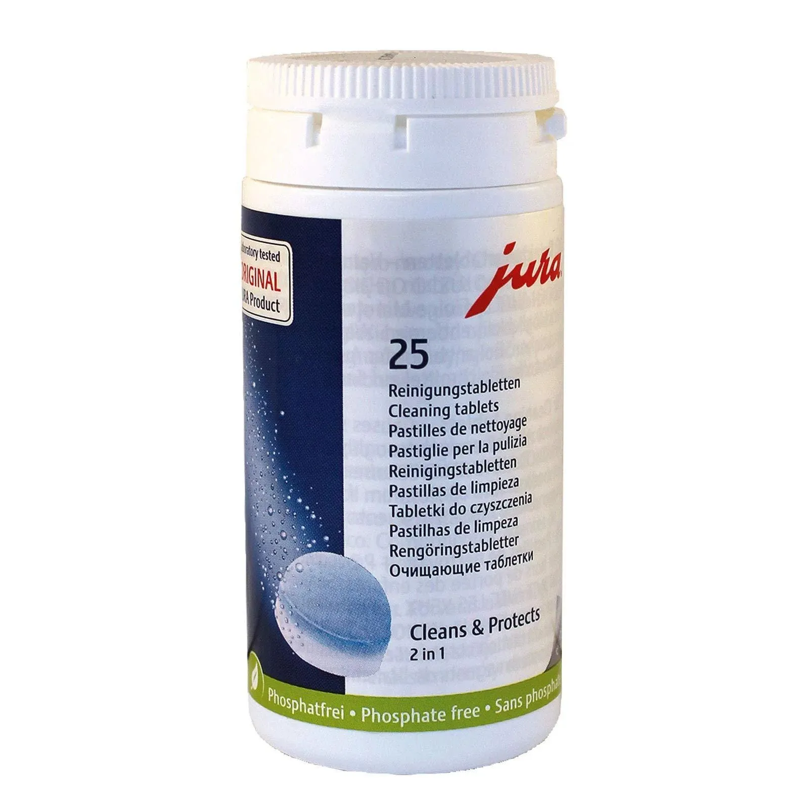 Таблетки для 2-фазной очистки очищают кофемашину и задерживают накопление остатков кофейного жира. Фаза 1 разрыхляет кофейный жир и частицы с помощью специальной формулы. Фаза 2 уплотняет поверхности с помощью специальных активных ингредиентов, защищающих их от остатков кофе и жира